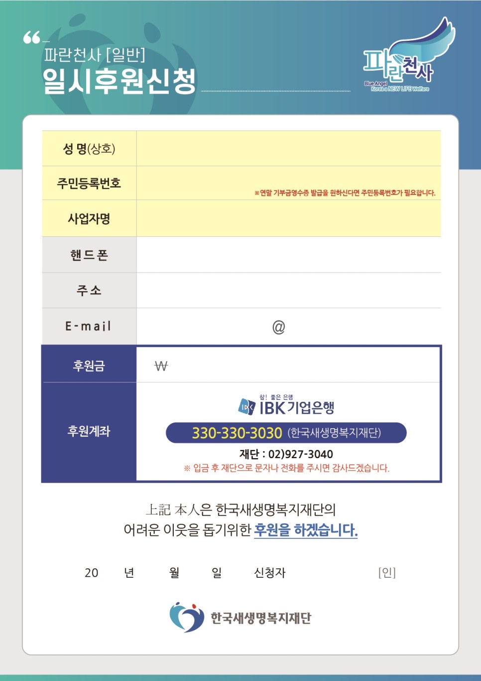 기업은행 330-330-3030 (예금주: 한국새생명복지재단)으로
